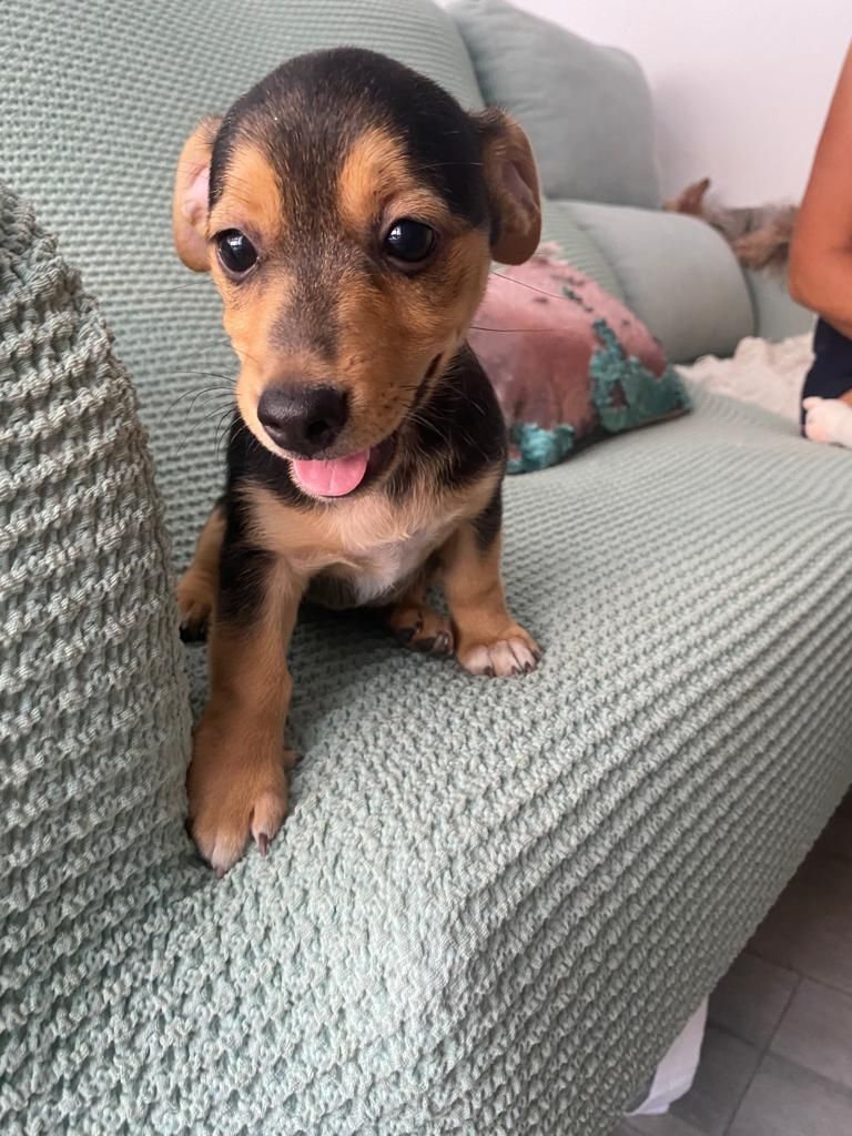 Conny wurde hochträchtig auf der Straße aufgegriffen und in die Perrera Resur in Linares gebracht, genau in dem Moment, als unser spanisches Team Hunde dort für uns heraus holte. Man begegnete sich im dortigen Büro und unsere Tierschützerin sah das kleine Hündchen auf dem Arm einer Angestellten des Müllzentrums, in das die Perrera eingegliedert ist, das gerade dort in die Zwinger gebracht werden sollte. Das kleine Hundemädchen hatte „Augen so groß wie Wagenräder“ vor lauter Entsetzen und Angst ob dem, was jetzt folgen sollte. Unser Team bat darum, die kleine Hündin, zusätzlich zu den anderen Hunden für uns, gleich mitnehmen zu dürfen. Ein Worker dort, zuständig für die Hunde, zeigte Herz und erlaubte die sofortige Mitnahme, auch er sah, dass die Hündin jeden Moment ihre Babies bekommen würde. Zur richtigen Zeit am richtigen Ort und Conny war gerettet.