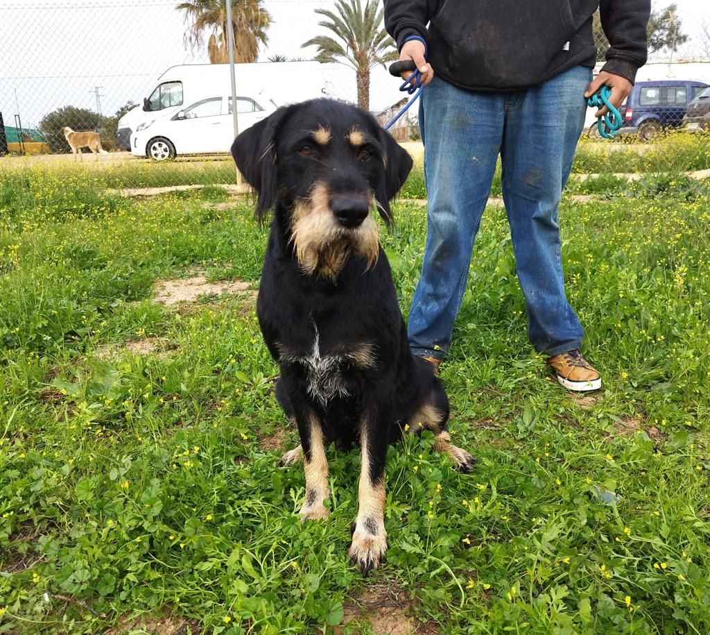 Hildegund wurde bei 40 Grad Hitze in der Nähe von Jerez de la Frontera an einer Tankstelle ausgesetzt. Die füllige Hündin war so entsetzt, dass sie mitten im Weg auf der Autospur quer liegen blieb. Tierschützer, die dazu kamen, fragten an, ob wir sie übernehmen würden da im anderen Fall nur der Zwinger in Jerez übrig bleiben würde, weil überall alles voll ist momentan. Wir haben zugesagt und Hildegund nach Sevilla in eine Hundepension gebracht.