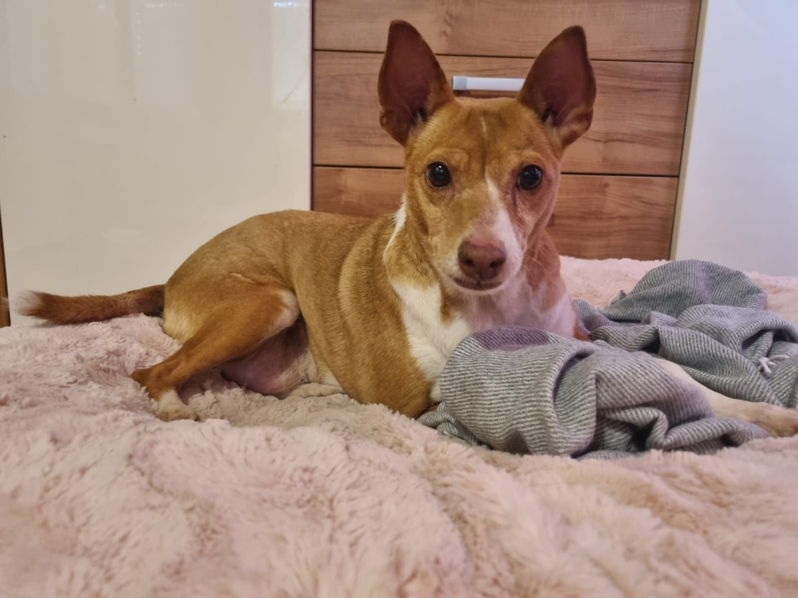 Die kleine, ältere Podenca Nesko stand in der Perrera inmitten des Zwingers mit viel größeren Hunden um sich herum und einem lauten Lärmpegel. Sie stand starr, weil sie nicht wusste, was hier mit ihr geschieht und weil sie mit einem „Riesentumor“ zwischen den Hinterbeinen dort abgegeben wurde. Es stellte sich heraus, dass sie einen Leistenbruch hat, also keinen Tumor. Sie konnte bis heute nicht operiert werden, da ihr Zustand zu schlecht war. Sie musste mühsam aufgebaut werden und auch ihr seelischer Zustand verbessert werden. Langsam erholt sie sich und es geht ihr viel besser. Sobald sie komplett stabil ist, wird die Operation gemacht. Nesko befindet sich auf einer spanischen Pflegestelle, die der Tierklinik angeschlossen ist und fachkundig. Es gefällt ihr dort sehr gut und sie fasst mehr und mehr Vertrauen zu ihrer Bezugsperson.